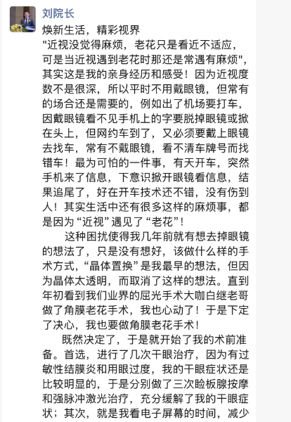 摆脱眼镜的想法,在刘才远院长心中已酝酿多年。“最早考虑过晶体置换手术,但总觉得自己的晶体还很健康年轻,现在就置换掉太可惜了。”尽管多年前就有摘镜的念头,但他始终在等待一个更合适、更自然的技术选择。直到今年,得知同行专家白继院长也成功接受了老视手术,他不再犹豫:“他的亲身体验,让我坚定了选择角膜老花手术的信心。”