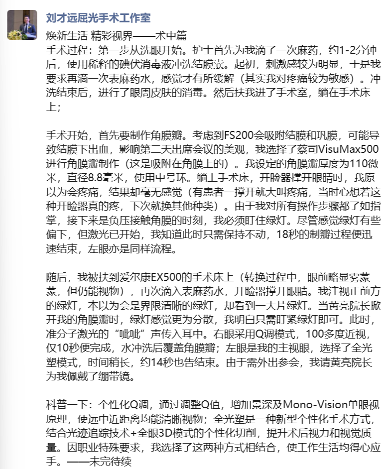 “手术全程不到10分钟,躺在自己熟悉的手术台上,反而比给患者做手术时更安心。”刘才远院长回忆起手术过程,细节仍清晰如初:“这次是黄亮院长为我主刀,他以前的近视手术是我做的,现在换他上手,这种信任很特别,让我能够以患者的身份沉浸式体验整个流程。”