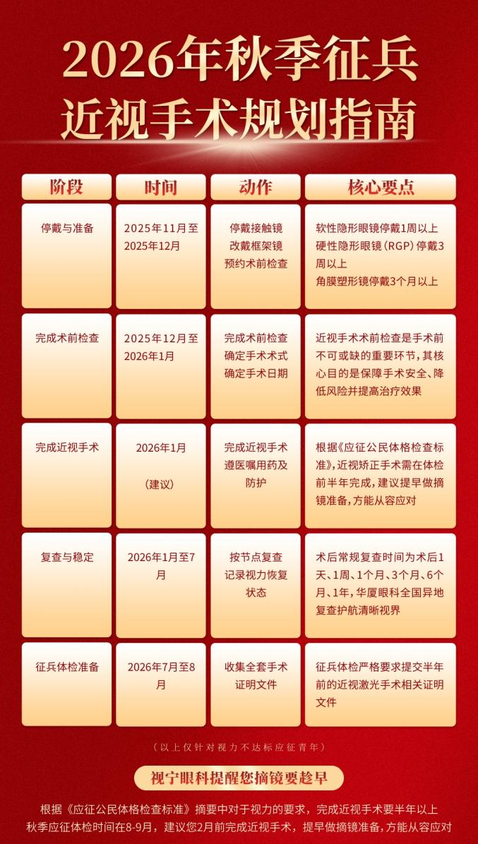 2026年全国征兵(男兵)应征报名通道已于12月1日正式开启,热血青年们的参军热潮已然来袭。报名条件是什么?体检有哪些硬标准?近视的小伙伴能顺利入伍吗?别急,这份超全指南+近视解决方案,视宁眼科为你一一拆解!